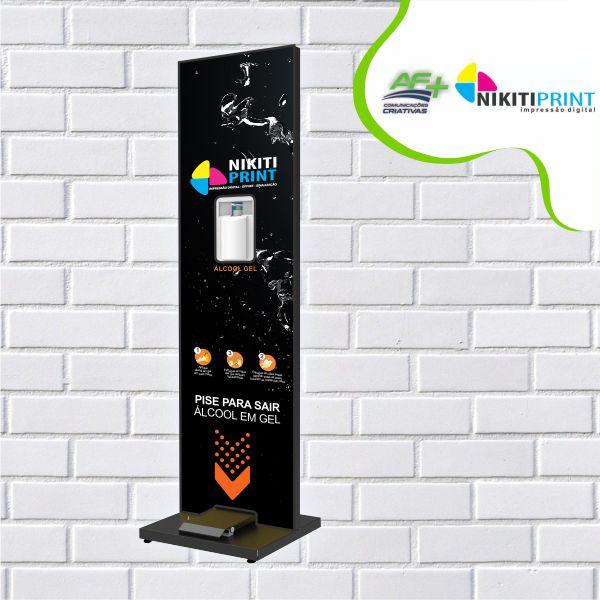 acionado por pedal na base ativando a bomba e extraindo o álcool para as mãos.